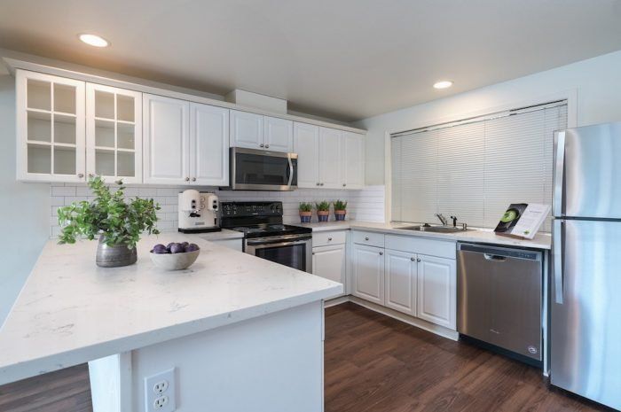 The Benchmark’s two-story townhomes are all 2 bedroom 1.5 bath units. Well appointed with large chef’s kitchens, wood-burning fireplaces, vaulted ceilings and ample storage and washer/dryer. With spacious private concrete patios, these townhomes are perfect for entertaining. Each home has been beautifully remodeled with granite countertops and luxury vinyl wood plank flooring.