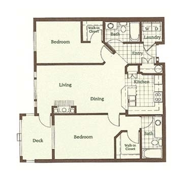 Bedrooms: Two large bedrooms with walk-in closets, separated by the living room for added privacy