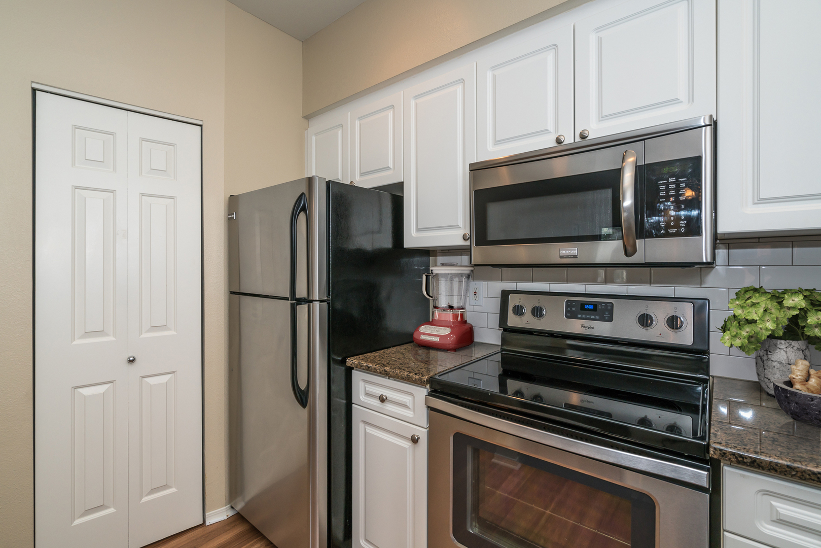 This unit has soaring 16 ft ceilings, a fireplace, two large covered decks. Luxury vinyl wood plank flooring throughout main living areas (carpet in bedrooms only- note that photos don't reflect this). Large, open kitchen has slab granite, subway tile back splash, and stainless steel appliances. Washer/Dryer in home.