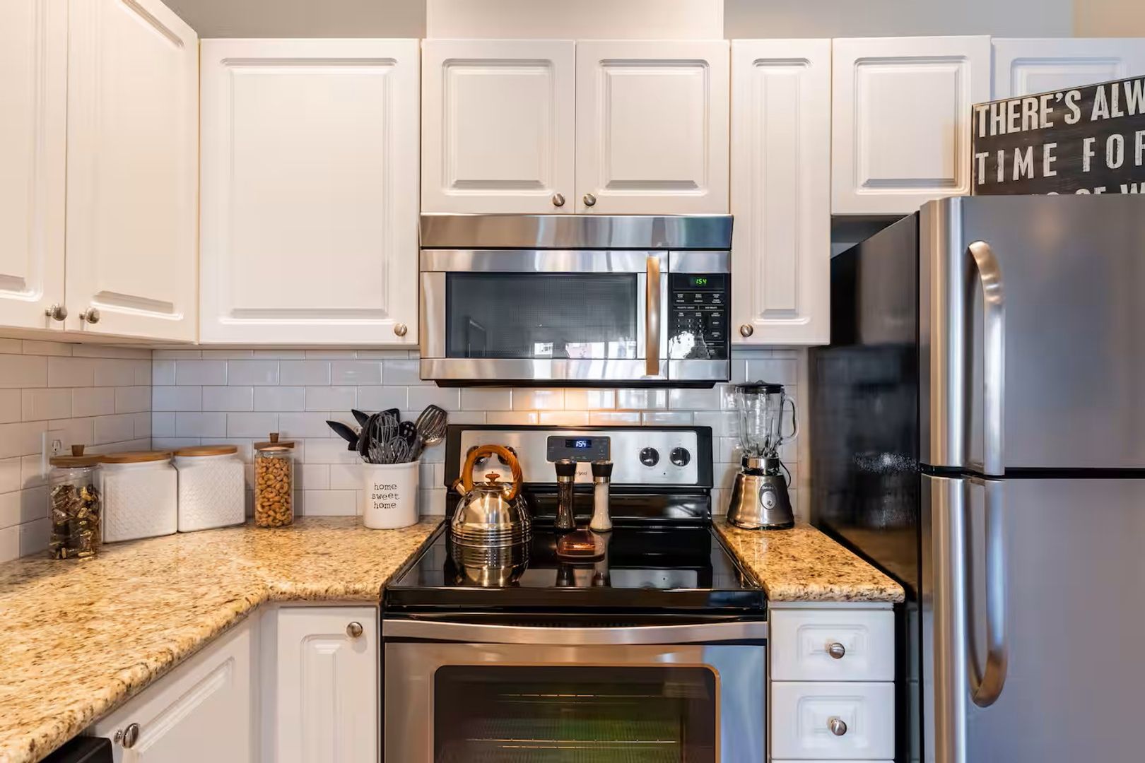Kitchen: Modern granite countertops, stainless steel appliances, subway tile backsplash, and complete with pots, pans, dishes, and towels.