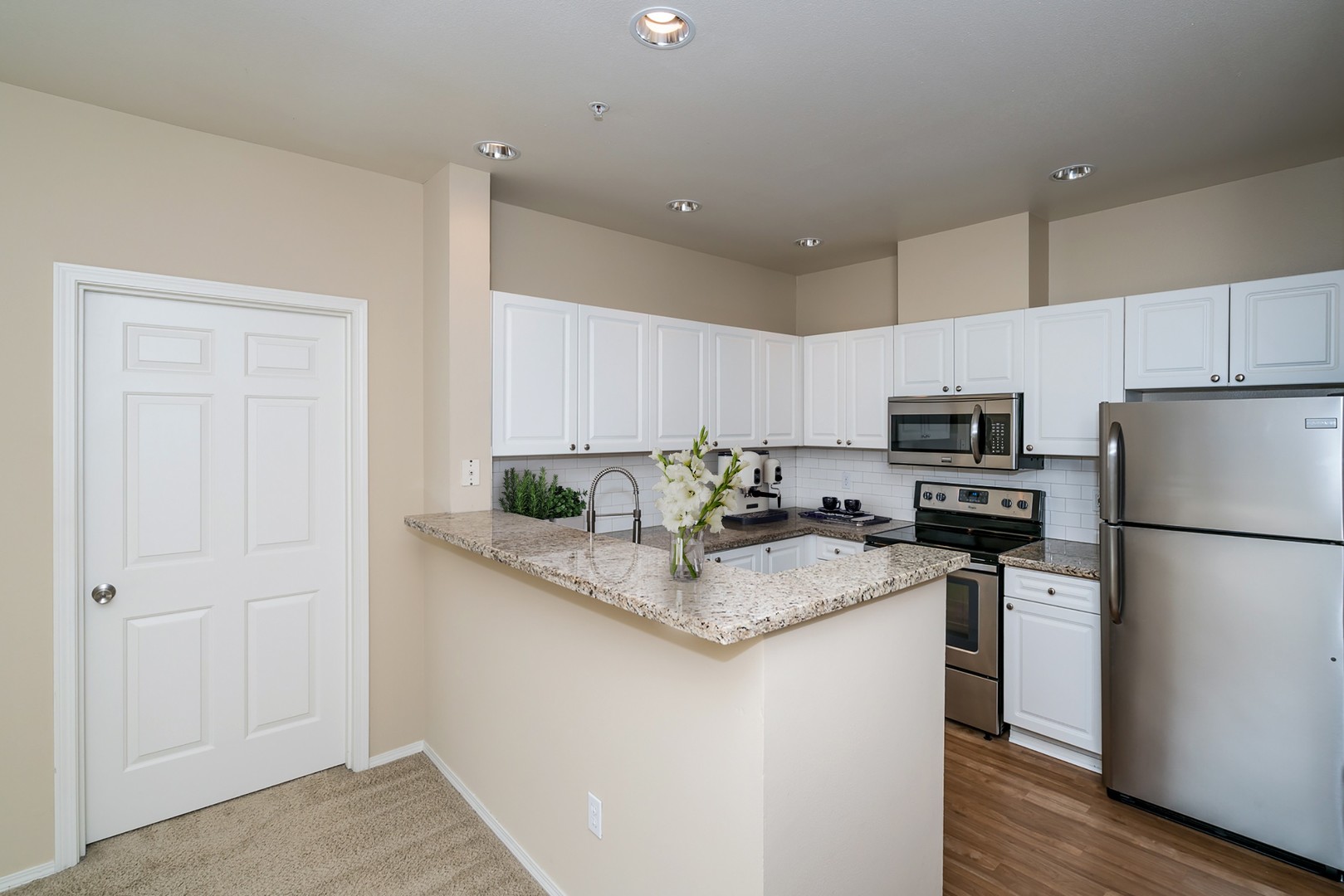 ✔ Open kitchen with granite countertops, stainless steel appliances, and subway tile backsplash