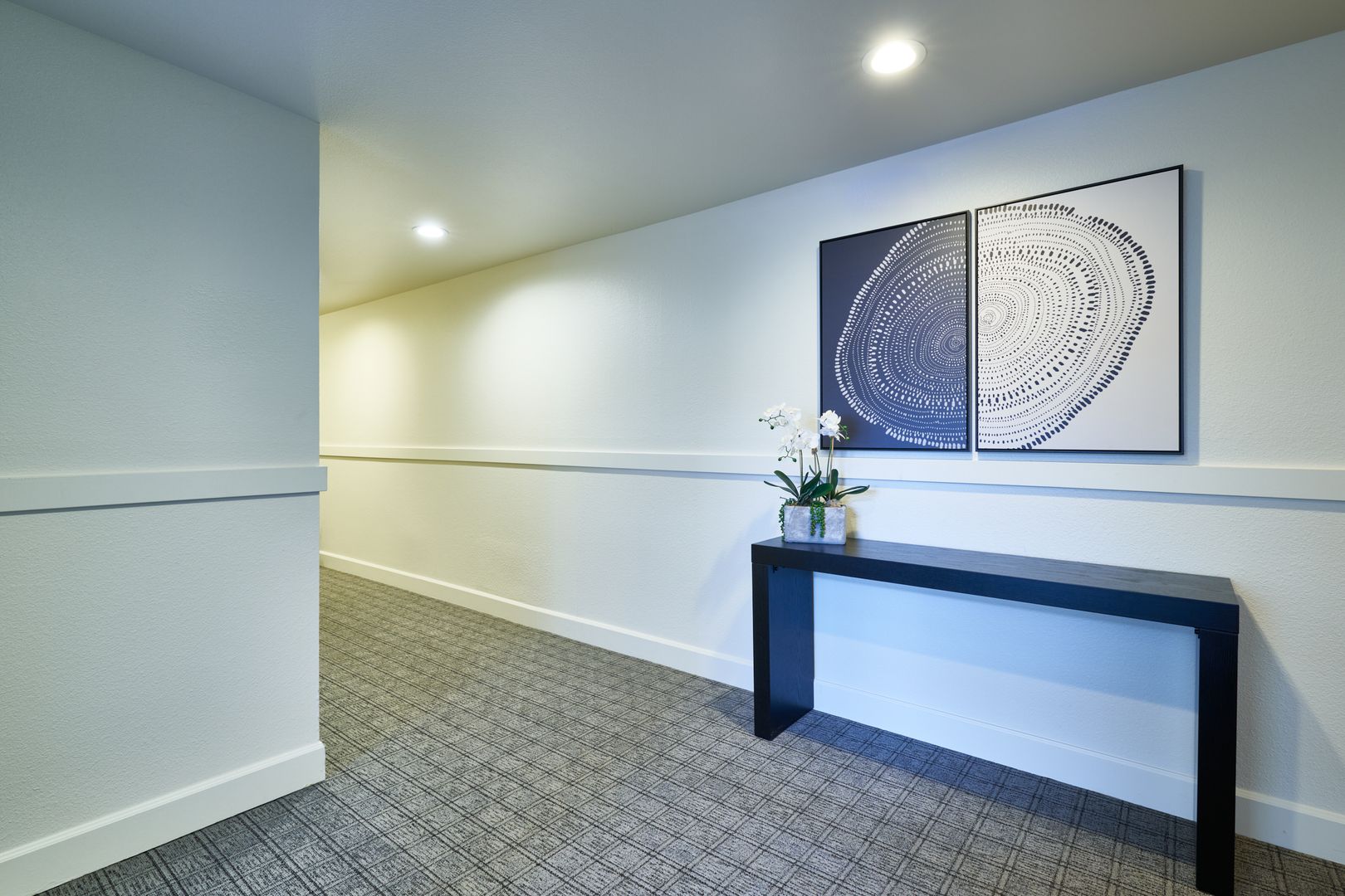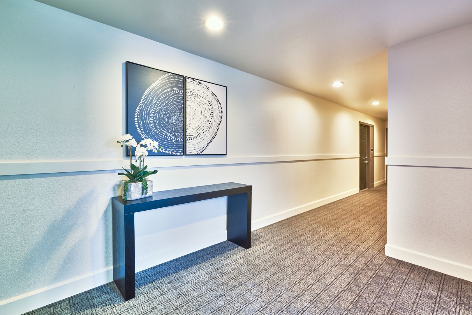 Apartment home is approx. 810 sq ft and has a washer/dryer in the unit. This unit has multiple window walls and ample light. Large covered patio. Kitchen has white paneled cabinetry, stainless steel appliances, subway tile backsplash and Quartz countertops. Large bedroom with walk-in closet. Luxury vinyl wood plank throughout. Upgraded carpet in bedroom only.