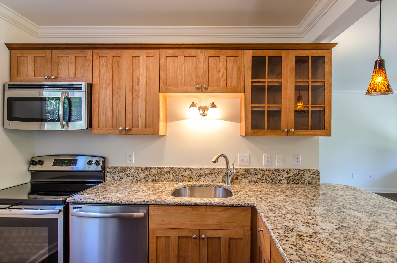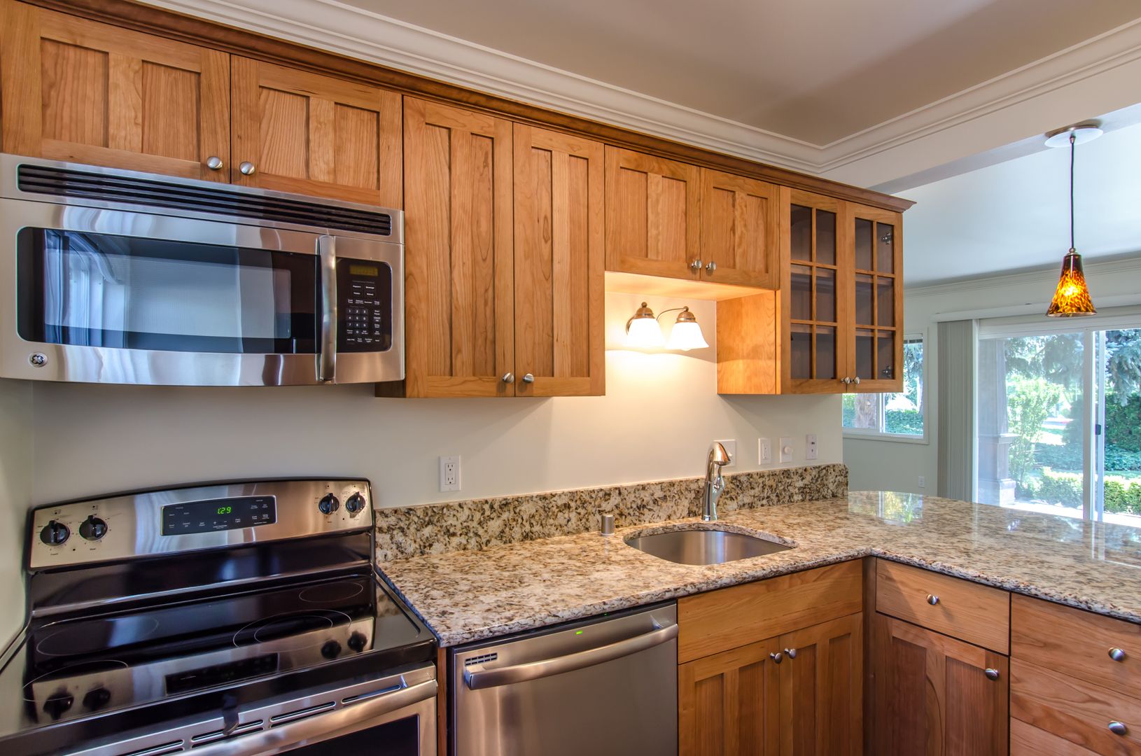 Kitchen with granite countertops, stainless steel appliances, self-cleaning oven with glass cooktop, microwave, frost-free refrigerator with ice maker, dishwasher